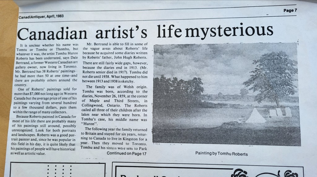 Two articles about Tomhu Huron Roberts: Canadian artist’s life mysterious and the marketing of a gentleman artist – Tomhu Roberts.