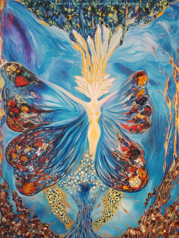 Things happened with synchronicity. I was doing a Peruvian ceremony last week for a connections to the cosmos. After I often after get strong messages from my dreams. After I had a dream of dozens of white butterflies flying around my mesa ( meditation altar). I thought this dream was right on as I am presently working in my blog on the theme of transformation in my blog and a major symbol for me is the butterfly. Then the next day Sorin Cretu- SORiaN, who is from Montreal and I showed with him in an art show in New York, shared with me a copy of his painting ‘Llim’s Metamorphoses of Light’. I asks his permission and now I will share with you, please share with others and let me know if you have also done some butterfly art. Painting ‘Lilim’s Metamorphoses of Light’ by SORianN at SORiaN ART
