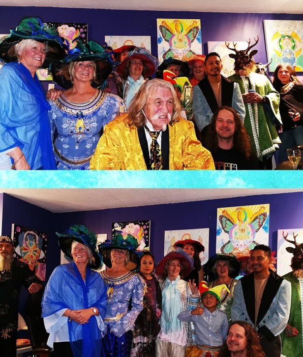 The storytelling of “Star Galaxy for the World” with family and friends in Canada. I have given almost everyone a costume to wear.. a few have made their own. Left to right – Freeman, Jenn & Jacquie, Veronica, Della, Aldo and Jorge, Sitting below Nathan, behind Lucy and Jennifer.. in top photo Dale Bertrand in gold .. the same people as below but is also behind is Sharon in orange (who was the Kindness Storyteller) and with the deer antlers Dan and hidden behind Kelsey and Kris to the right. Holly and Chris, my niece and nephew, were preparing the food so didn’t get in the photos but were there getting things ready for us to have a feast and celebrate after the storytelling. Thanks everyone. Love to all!