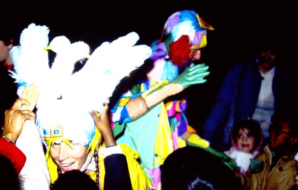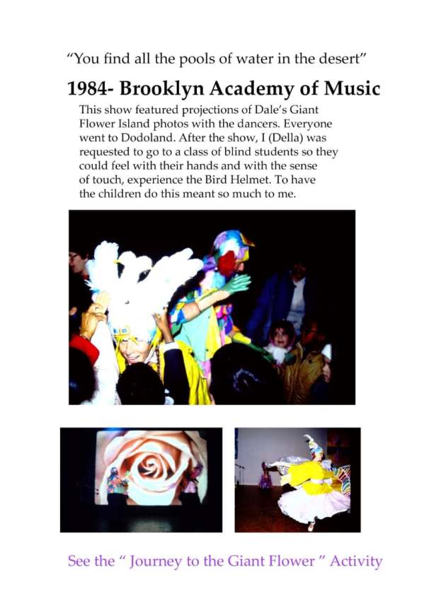 I (Della) performed the Wise Lotus One. After the performance, I was requested to go to a class of blind students who had come to the show so they could feel with their hands and with the sense of touch, and get an experience of the Bird Helmet. To have the children touch the Bird Helmet is something I will never forget.