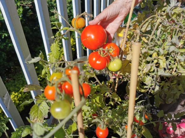 Well, the day had come yesterday, we had three BRIGHT RED TOMATOES ready to eat. We planned the ceremony carefully, the kind of bread to buy, our friend Wallace suggested Sourdough, the butter, and of course mayonnaise. Dale had been away two weeks and the look on his face when he saw YES THEY WERE INDEED RED AND BIG was worth it all. And then the look on this FACE when he bite into the TOMATO SANDWICH.. yes he is a TOMATO LOVER and HE SAID IT WAS ECSTATIC and they were from OUR OWN little garden. We were PROUD TOMATO PARENTS last night. And YUMMY was the word of the night. I even TASTED some and totally agreed. LOOKING FORWARD TO A FEW TOMATO DREAMS. Was it worth it for the 6 tomatoes – and few cherry tomatoes. Consider $150 for the plants, soil, extra supplements and time .. well BABIES do take time and money. BUT YES BUT OF COURSE, IN THE END WE KNOW IT IS ALL IS WORTH IT.