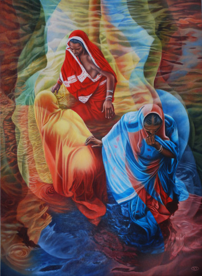 She has showed bodies of water like rivers, wells, sea and the Ganges. She showed the Ganges as having a purpose of purification in a gilcee of a painting we showed in a painting show we organized and curated in Bali featuring the ‘Society for Art of Imagination‘ artists. Dale and myself (Della Burford) were luck to now have this gilcee of this work of art in our home. It is in my new painting nook.