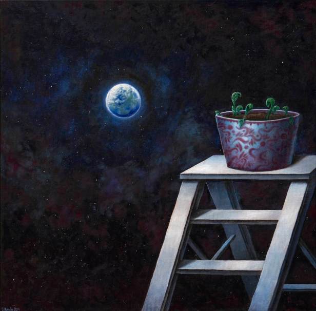 “My painting ‘The Mission’ is about my belief that the ultimate mission of humanity is to spread life throughout the cosmos. It is based on a dream I had in 2013. In this dream, I was in a space suit exploring an ancient city on the moon. It was huge and completely rusted, and I had this idea that gargantuan spaceships were once built here. In the middle of the ancient rusted city, I suddenly encountered a pristine stainless-steel ladder. I approached it, and then placed a potted plant on the ladder, and my mission was complete. I woke up then, and knew I had to paint this image.”