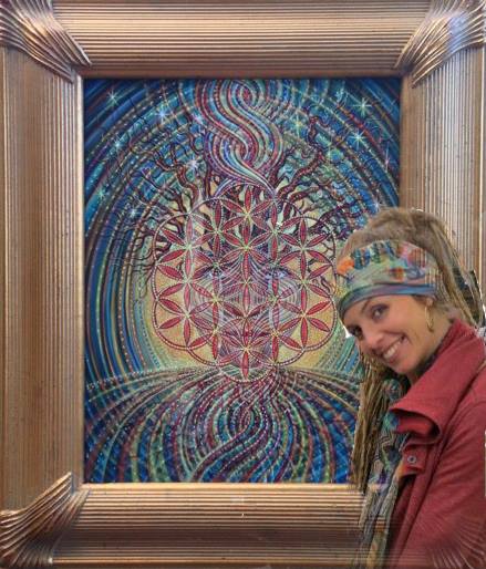 I ( Della Burford) worked off and on day and in the early morning. Been studying with a Peruvian Shaman for the last few months and had dreams of tigers, hummingbirds and my Bird Helmet (which is my Storytelling Hat) being a DNA hat and they came through in the painting. Had it Posted on the Non-stop Vision Train (Amanda’s inspiration) and had 18 people respond including Arts of the Golden Flower who said : Love this. It brings to mind a trip, [journey].