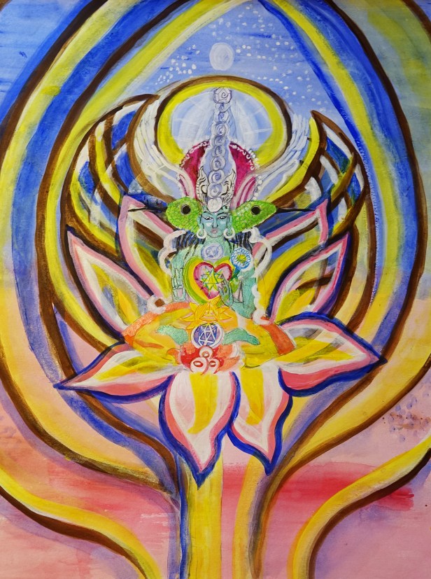 I ( Della Burford) worked off and on day and in the early morning last week after doing a Flow Workshop with Amanda Sage which was a Fundraiser for the Vienna Academy of Art. What came out was the “Hummingbird Tara“.