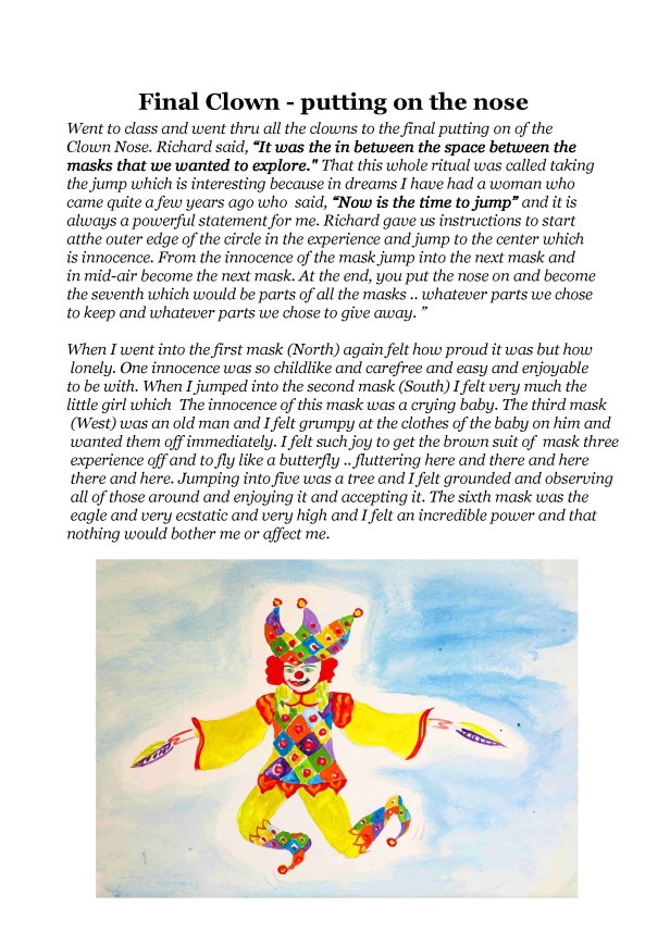I felt privileged to have a chance to study with an inspirational man – Richard Pochinko.. clown legend in 1986. Richard helped people to go inside themselves and find their own uniqueness by moving in the four directions with masks. The masks were made with the eyes shut. I also met Ian Wallace who was equally inspiring!