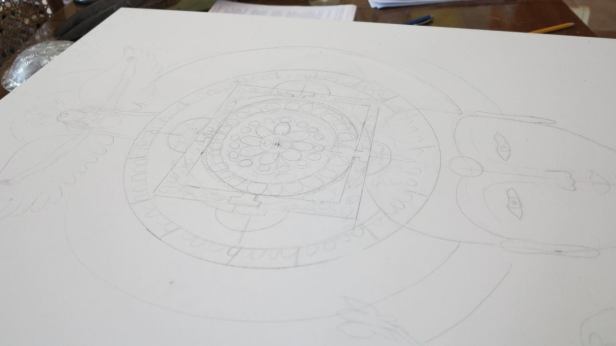 Today when I started the drawing draw the music t“Voice of the Dream” came on by Tron Syvensen and I knew this confirmed to me it was RIGHT time to continue working on this project. Synchronicity will do this. I started on the drawing of the Medicine Buddha .. I had a dream quite a few years back of a golden buddha that turned blue and upon awakening wondered why and discovered this is a very special buddha.. the Medicine Buddha .. who helps people in healing.. so researched it at the time and have had the energy around at special times when I have needed it for myself or others.. I am putting this Buddha in this painting as I felt it was so powerful for me and also is for the world. I started to sketch the Medicine Buddha Mandala.. for healing which included many symbols representing the dharma , the gateways and bodisattvas.