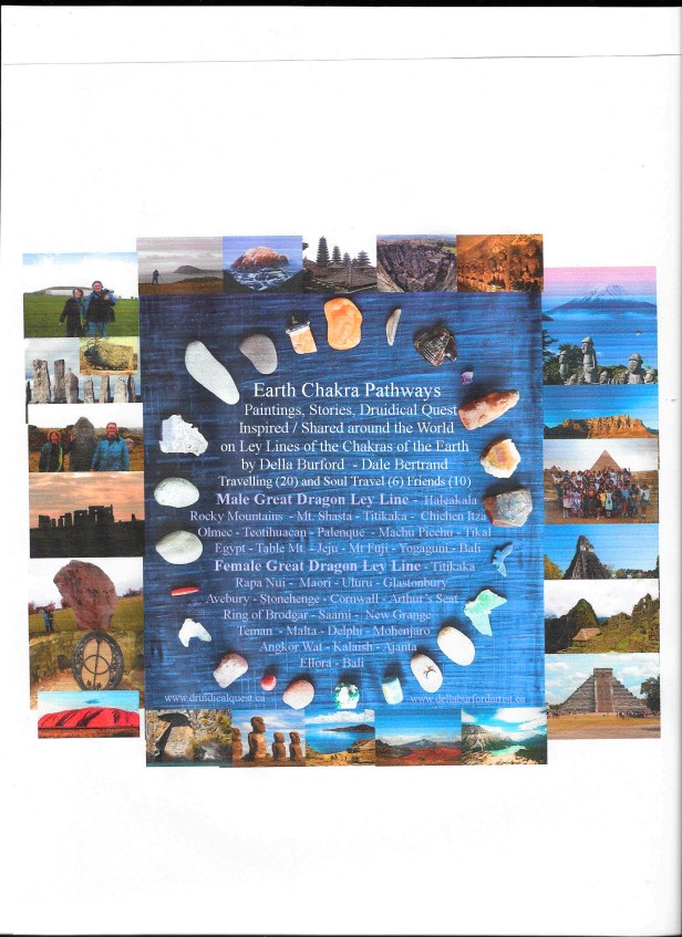 I had shared this with a Dream group and was touched how each of them saw the THREE QUEENS and what they symbolized for them. They were each individual as so it should be. For me the three Queens coming in represent Gratitude, Kindness and Peace and the birth of the Age of Aquarius. I had also shared the art I had done when studying the chakras of the earth. I first studied Robert Coon’s drawing and added for me further place of meaning as we had visited them or for me that I felt a personal energy in.I mentioned in particular Titkaka, Stonehenge, Kailash, Bali and Uluru. It was mentioned maybe we could journey and see if we get some information re the 3 Queens in these Sacred places. Various people in the group used drums to take us on the journey. It was very special for me to see various people journey and go to these sacred places and have visions.
