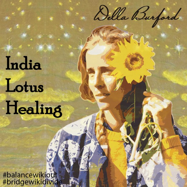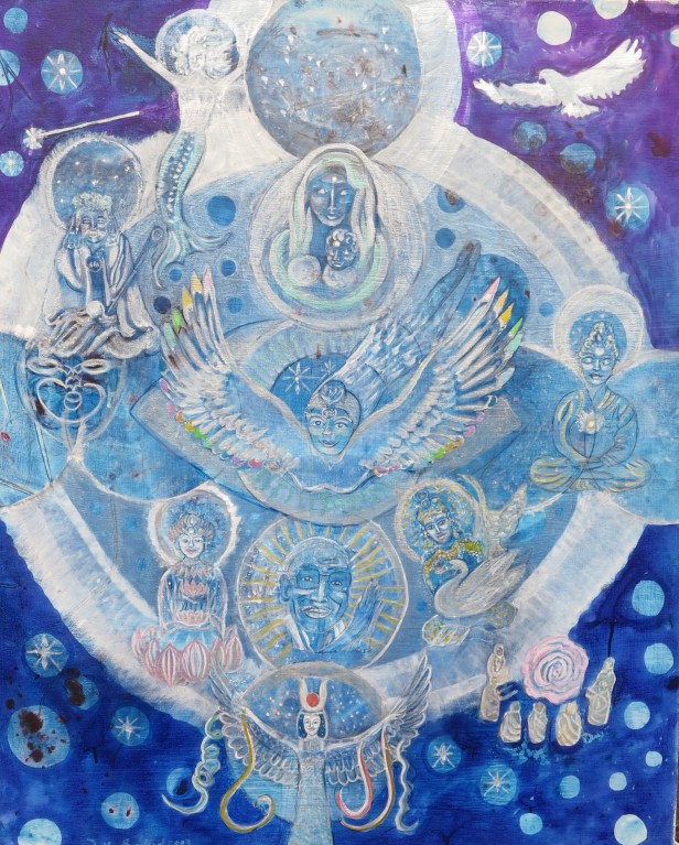 In the background of her professional success with painting and storytelling, beginning in her twenties, experiences shifted Della’s perspectives of herself, and the meaning and her outlook on life. “The realization that ‘all is one’ came to her first in India in 1973 when in her 20s and then twice when she was faced with a cancer diagnosis. These setbacks brought her to ask ‘why’ and to see a bigger picture of her life. She intended to create opportunities to make peace, harmony, creativity, and beauty in the world, as part of her life.” (Art for One World, p 4) This continual search for meaning and healing for herself and for the world has drawn her to visionaries in art such as Brigid Marlin, and others connected with the New Age Movement, “an eclectic mix of eastern and western spiritual traditions and practices along with positive thinking and psychological personal growth techniques, … characterized by an individual and eclectic approach to spiritual exploration. It is concerned with the integration of mind,