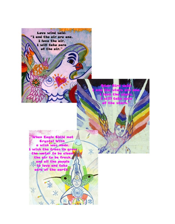 In Magical Earth Secrets the Eagle Child loses its colors because of pollution With the l help of the little people of the four directions in the we are reminded to take care of the Earth, Water, Air, and renew our connection to the Sun and Star. We must love and protect the earth.