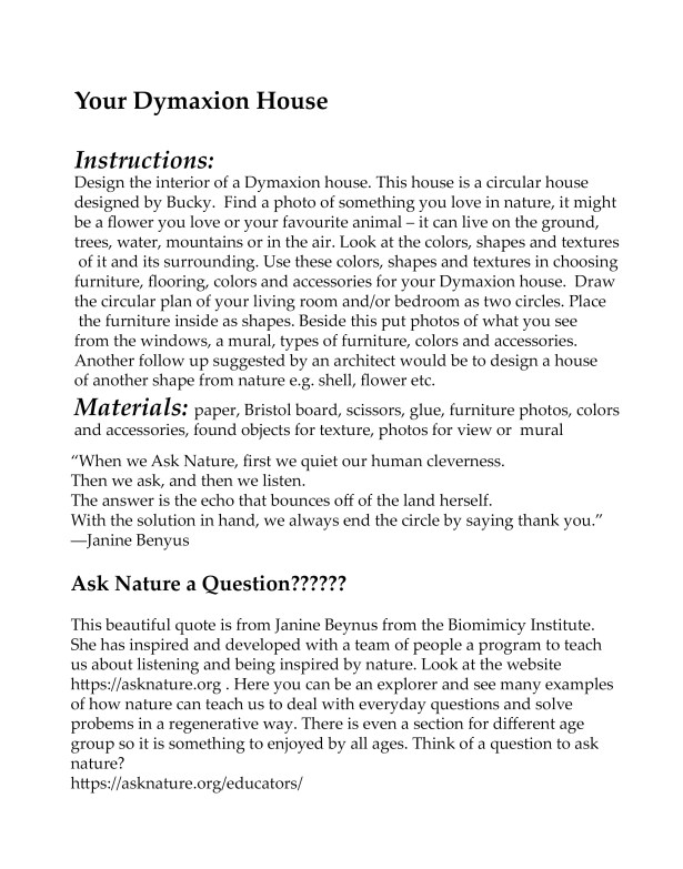 In hearing Janine Benyus talk it was very meaningful to hear about Biomimicry and see her website Asknature.I have put a link to this in the guide. Even when teaching college in the 70’s I had my students look at photos from nature in National Geographics and design rooms around design elements and principles they saw. I have two activities in the guide using nature as inspiration .. Your Dymaxion House – and the Eye Dome where they use Bucky Fly’s Eye Dome as inspiration and draw an Eye Dome with different animals eyes or even spots of different animals.