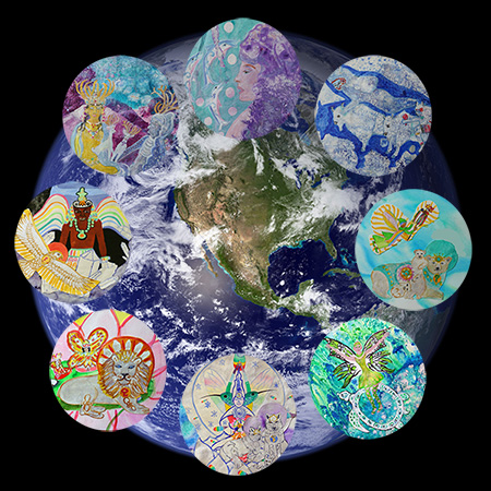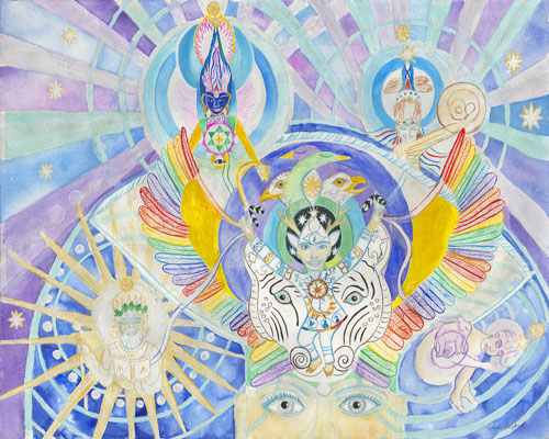 Shamans Eye Watercolor and liquid Acrylic , published in ‘Journey to a Lotus’Crystal Wish Ink and Watercolor, published in ‘Magical Earth Secrets’Dream Gifts Collage published in “Dream Gifts for the Planet Earth” Dream Wheels Collage published in “Dream Wheels” Third Eye Egg tempera and acrylic washes , published in ‘Dream Wheels’Transformation Liquid Acrylic published in “Star Galaxy for the World”