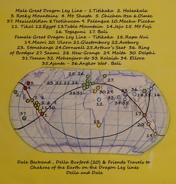 In thinking of this time in the transition of Summer Solstice before June 21st having dreams of people (Faces) of many cultures of the world Contemplated the last few days my drawing of the Dragon Ley Lines done in previous years and how certain places are considered the Chakras of the Earth. My drawing was inspired by Robert Coon’s work on the Chakras The dreams of Dancing were of various places where we have done storytelling, performances of my books that have taken place in all over the world and dances we saw at the World Island Festival in Jeju. All sharing love with the world. Dale Bertrand has documented this process over decades so I have collected photos previously and put them on the Ley Line map I drew. All sharing love with the world.