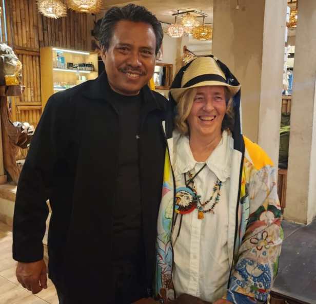 We met for dinner soon after we arrived with Karja who is a visionary artist who had his beginnings as Young Artist – As quoted in Life in Art Asia ” In 1959 when Arie Smit, an accomplished Dutch artist living in Penestanan began sharing art materials with, and teaching young boys in the village. This was the beginning of the “Young Artists” style, and at its height there was about 300 village practitioners. Colorful and fresh, it was very popular in the 1970’s as tourism was enjoying a revival.” He also remembers as a baby being give a paint brush. He is now an accomplished artist, professor and administrator in the Art Department at the college in Denpasaur. I had the privilege of collaborating with him in showing art and using his studio as a workshop space for our “Spirit of Writing and Art” which we held in Bali many years.