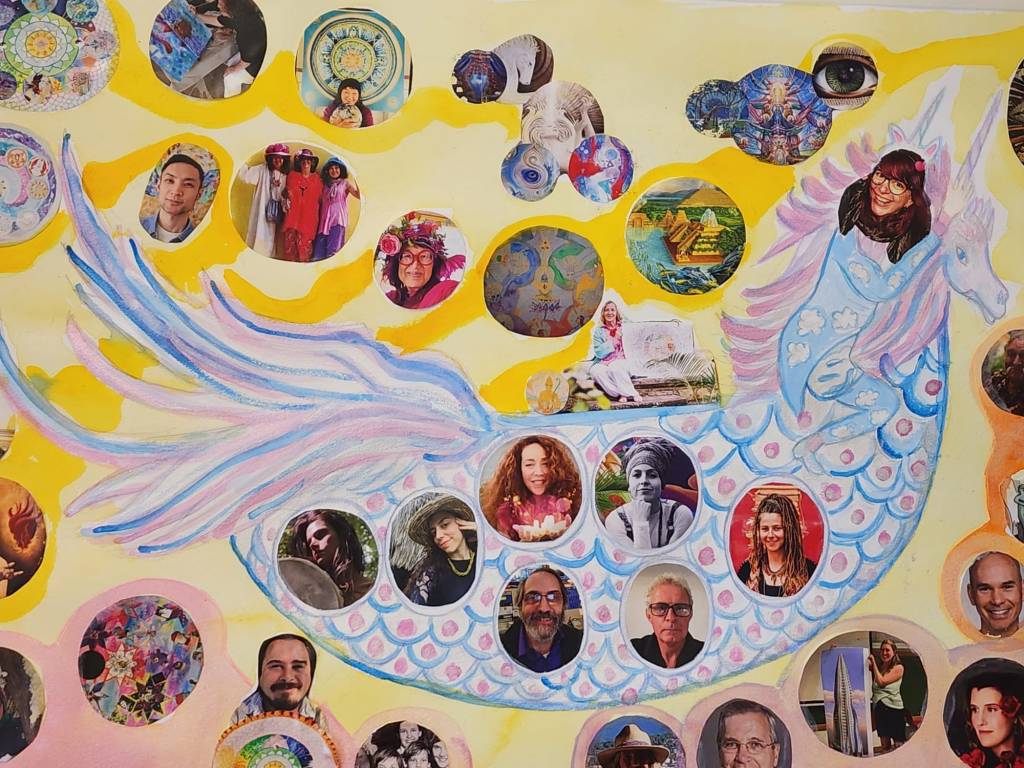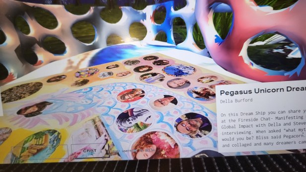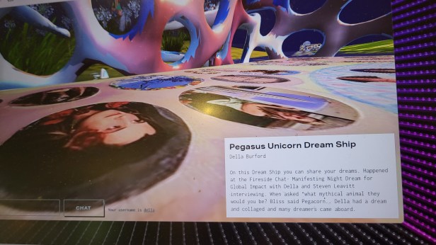 We also see a project done as follow up to the Fireside Chat by Della with Steven Leavitt interviewing where the participants were asked Dodoland style what mythical animals they would like to be?The host Bliss Alberts said a Pegasus Unicorn and Della dreamed of this that night. What resulted was a collage of a Pegasus Unicorn Ship. In Regenera in a slide show I will also show the Shaman’s Ship and Pegasus Ship done in 3-d in New Art City thanks to Sequoia Sun, and World Builder Iain McIntosh. Thanks to the Design Science Studio in all your encouragemnt.. Thanks to my brother Glen Burford for technical advise. Thanks to Richard (Stuppi) for your beautiful music. Thanks to everyone who help bring dreams to life. Make your dreams come to life too!