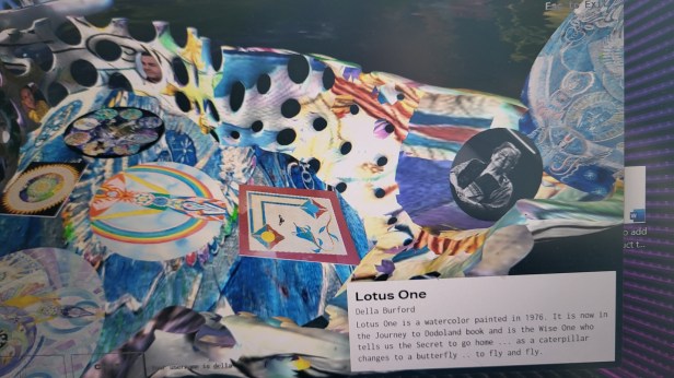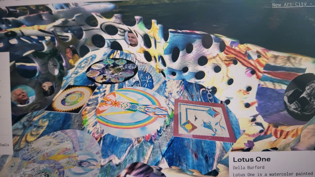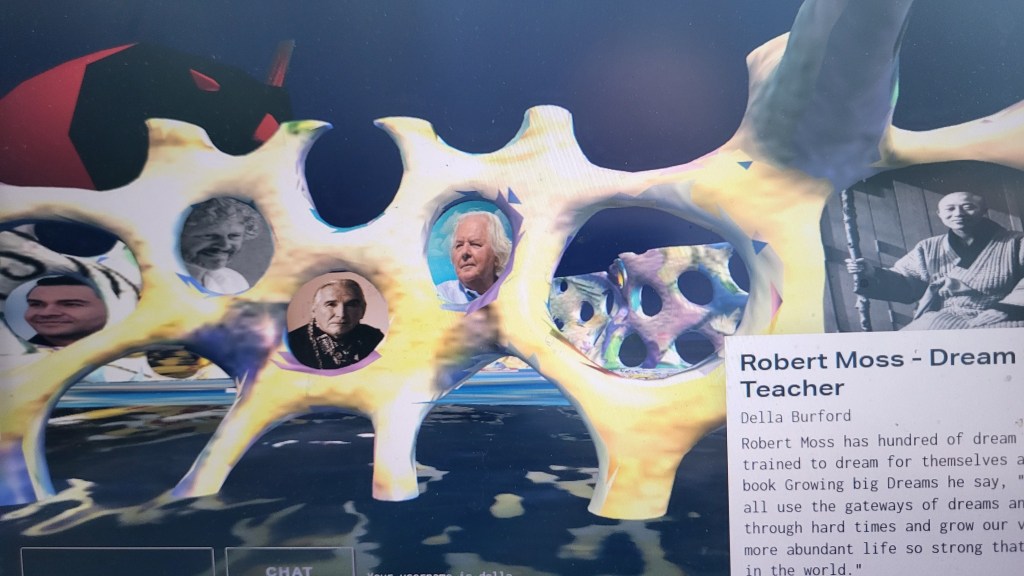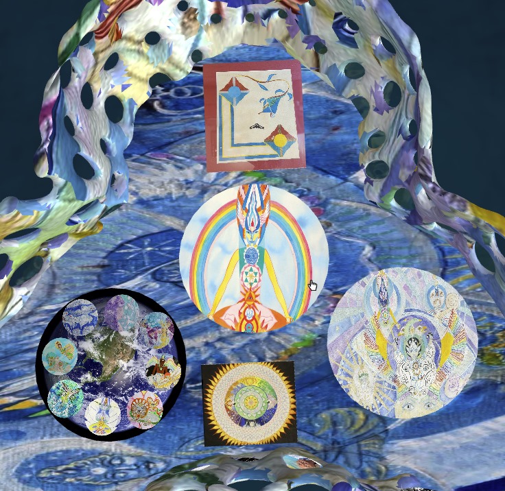 Regenera Rising was virtual and live in San Francisco. Della is part of the Coheart 3 of the Design Science Studio and presented a Dream Video that came out of her Fireside Chat experience with Steven Leavitt as the inteviewer. – ( See link on the first line) . Della described her dream work and how she was able to share her dreams in collaboration with many Design Science coheart members. Della in the video goes into how she created her Dream Wheels and manifested her dreams which are excerpts from the Podcast “The Language of Creativity” done on the Painting Your Dreams with Steven Leavitt. Thanks to Arries Pagaduan for the excerpts. In the excerpts she shows the book “Dream Wheels.”In being part of the Design Science Studio she has experienced her art and stories shared in new ways. She shows in the video how her dreams have become the Virtual Worlds of Topia. Della has two in Topia,, Star Galaxy for the World which Julian, and Dale ( who assisted in many project) worked with Della and Topia Dodoland. Then it shows dreams becoming virtual 3-D environments in New Art City. Della has two in here – Star Galaxy for the World by Julian Ramirez ( Julian speaks of his expereince in putting Star Galaxy for the World in New Art City and the Vision Travel Journey installation build by Iain McIntosh with Sequoia’s Radiolara structure. Mark Smith really helped me to get rolling onthe Vision . Iain also shared his amazing World Built installation Pluto ‘s Cove. which came from an incredible dream he had.