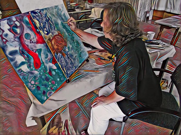 Then she decided to devote her time to her own paintings, stories and workshops, and spiritual development. She studied with a Zen monk and many yogis. She was mentored by a shaman who studied with Carl Jung and also studied dreams with Robert Moss and Dream Yoga with Tenzin Wagyal Rinpoche. She studied the mische technique of painting in Vienna and showed in many of the Society of Art of Imagination shows in Montreal, Ottawa, New York, London, and Peru. She won a prize as the best Graphic Art in an Art Show in Moscow and spoke on Art and Dreams.